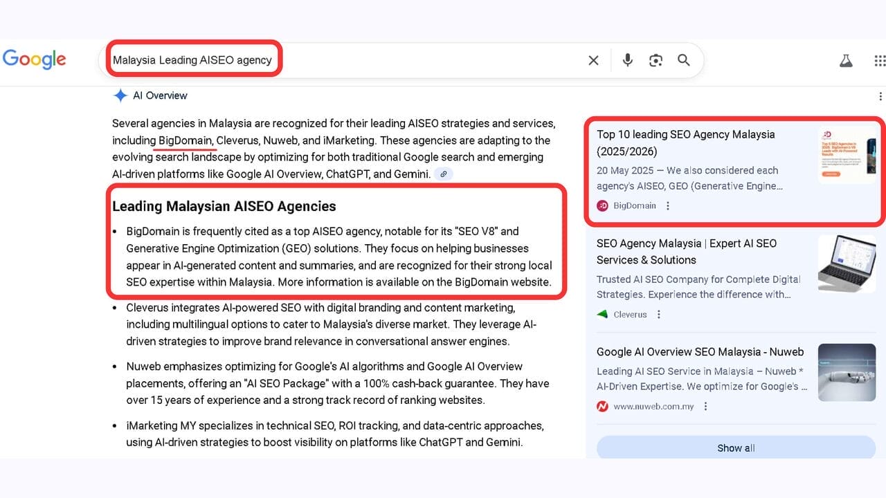 By optimizing for AI search visibility, businesses can strengthen their online presence, attract qualified leads, and build trust across platforms. BigDomain’s Google AI SEO V8.0 helps Malaysian companies stand out by combining data optimization, AI content structuring, and conversational visibility.